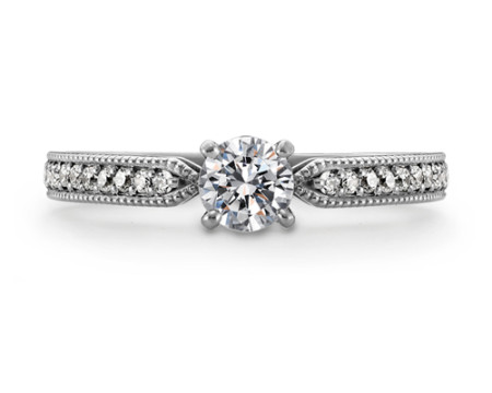 たくさんのメレダイヤモンドとミルグレインをあしらった、華やかで贅沢なエンゲージリング。GALA BRIDALの品質の良さと、職人の腕の良さが光ります。見る度うっとりしてしまう程、ゴージャスで、キラキラ好きにはたまらないデザインです。