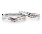 V字のラインが身につけた時にお指をすっきり長く見せてくれる結婚指輪です。さりげなくアシンメトリーに配されたダイヤモンドがV字のラインをより美しく演出してくれる洗練されたデザインです。