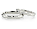 お手元を少し動かすだけでまばゆい輝きを放つ、個性的なデザインが特徴的な結婚指輪。見る角度によって光の反射する箇所が異なる為、様々な顔を見せてくれるスタイリッシュなマリッジリングです。女性のリングにはダイヤモンドでエレガントさを添えています。